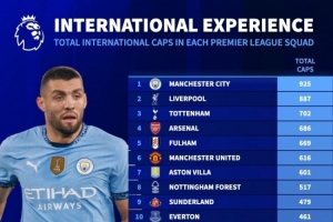 英超各队球员国家队出战场次榜:曼城925场居首,利物浦887场次席