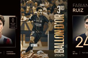 体育资讯09月23日讯 2025年金球奖颁奖典礼凌晨举行,巴黎成为本届金球颁奖的最大赢家,他们有8位球员入围提名,登贝莱最终捧起金球奖杯。