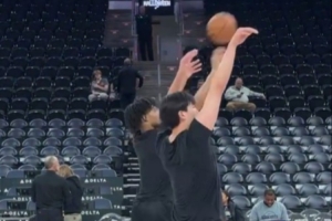 练起来!杨瀚森赛前和夏普一起进行三分投篮热身