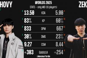 Chovy-Zeka本次世界赛数据对比:Chovy所有数据均领先Zeka