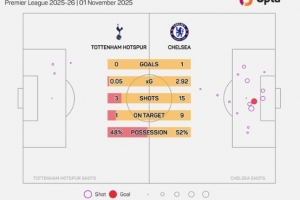 热刺0-1切尔西全场数据:射门3-15,射正1-9,控球率48%-52%
