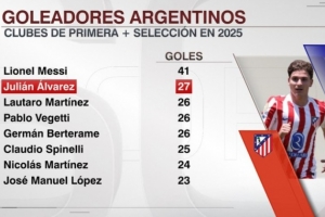 仅次梅西!阿尔瓦雷斯2025年俱乐部和阿根廷国家队已打进27球